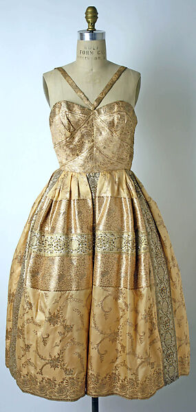 Inventive in fabric choices throughout his career, Mainbocher was intrigued by the sari's construction and cloth. In this example, he uses Indian export silk with brocaded borders in the manner of sari fabric.