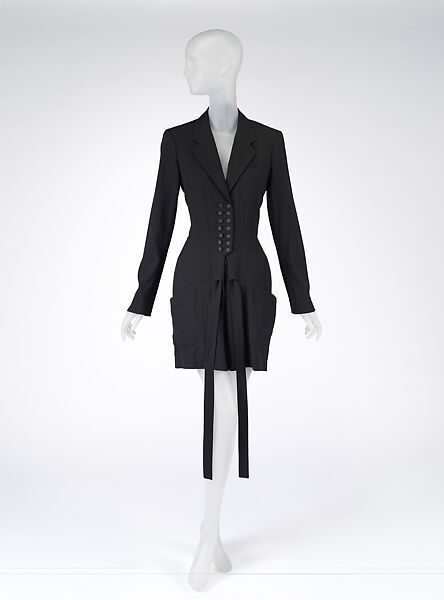 Azzedine Alaïa focuses on the challenges inherent in the transformation of two-dimensional textiles into sculptural three-dimensional garments. His sharp, engineered tailoring results in armor-like silhouettes typical of the power dressing of the 1980s, yet his use of body-clinging and tactile fabrics betray a more sensual approach to the body. This corseted, woolen little black dress with a double-breasted closure and wide lapels fuses masculine and feminine dress codes into a garment characteristic of Alaïa's commanding signature.