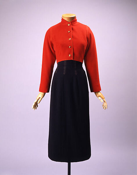 Combining a high-waisted skirt with a cropped spencer-style jacket, McCardell recreated the Empire proportions, but with a sleek silhouette. By disturbing conventional proportions, McCardell fostered the interdependence of the two garments, though either one could theoretically stand separate from the other. Menswear, even down to smart dressing in the crisp manner of military spencers, obtained, as McCardell seized the vivid Stendhalian heroism of red and black.