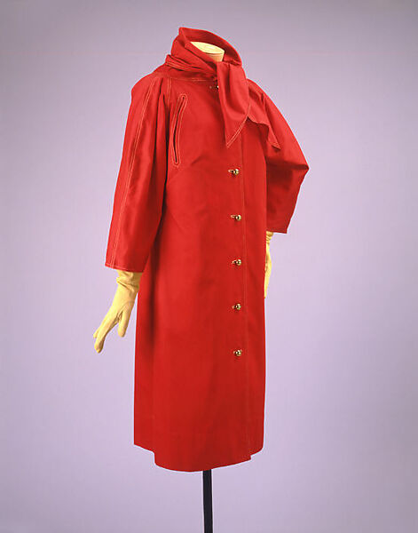The multiplicity of options offered in this raincoat's collar transforms a rainy-day necessity into something personal and creative. And McCardell has also thought of practical matters; big crescent pockets (which are inspired by menswear breast pockets), articulated in white stitching at the upper chest, allow for dry stowage. In the 1947 "Corolle" or "New Look" collection, Dior had perched tiny pockets at the bust; McCardell has made roomy, usable pockets.