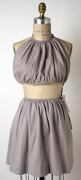 McCardell was among the first in the post-War period to discern not the "man in the gray flannel suit," but the woman in gray wool, an inconspicuous, but notably chic outfit for the beach combining a bare halter with a wrap skirt. This was the American counterpart to the contemporary invention in France of the bikini; McCardell's is a two-piece ensemble that respects American standards of propriety. McCardell wraps with a fullness of cloth both at the bust and waist, diminishing the overt sexuality of the minimal bikini and providing a sizing that will flatter a variety of body types in that most sensitive of garments in body and self-esteem, the bathing suit.