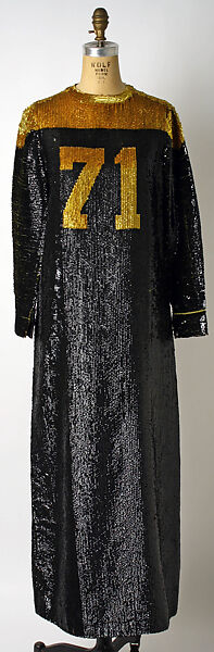 Active sports have repeatedly inspired designers of women's sportswear, though chiefly by the sports in which women engage. Football is yet a male preserve; even football watching is defined as a male activity. Beene tells the story of being solicited by a "football widow," one whose football-season afternoons are lost to a husband watching games on television, to make a knock-out dress to get her husband's interest even on a bowl Sunday. Beene took to the field and rendered the football jersey into a sequinned evening gown slinky enough, opulent enough to take attention away from the game, at least for half-time.