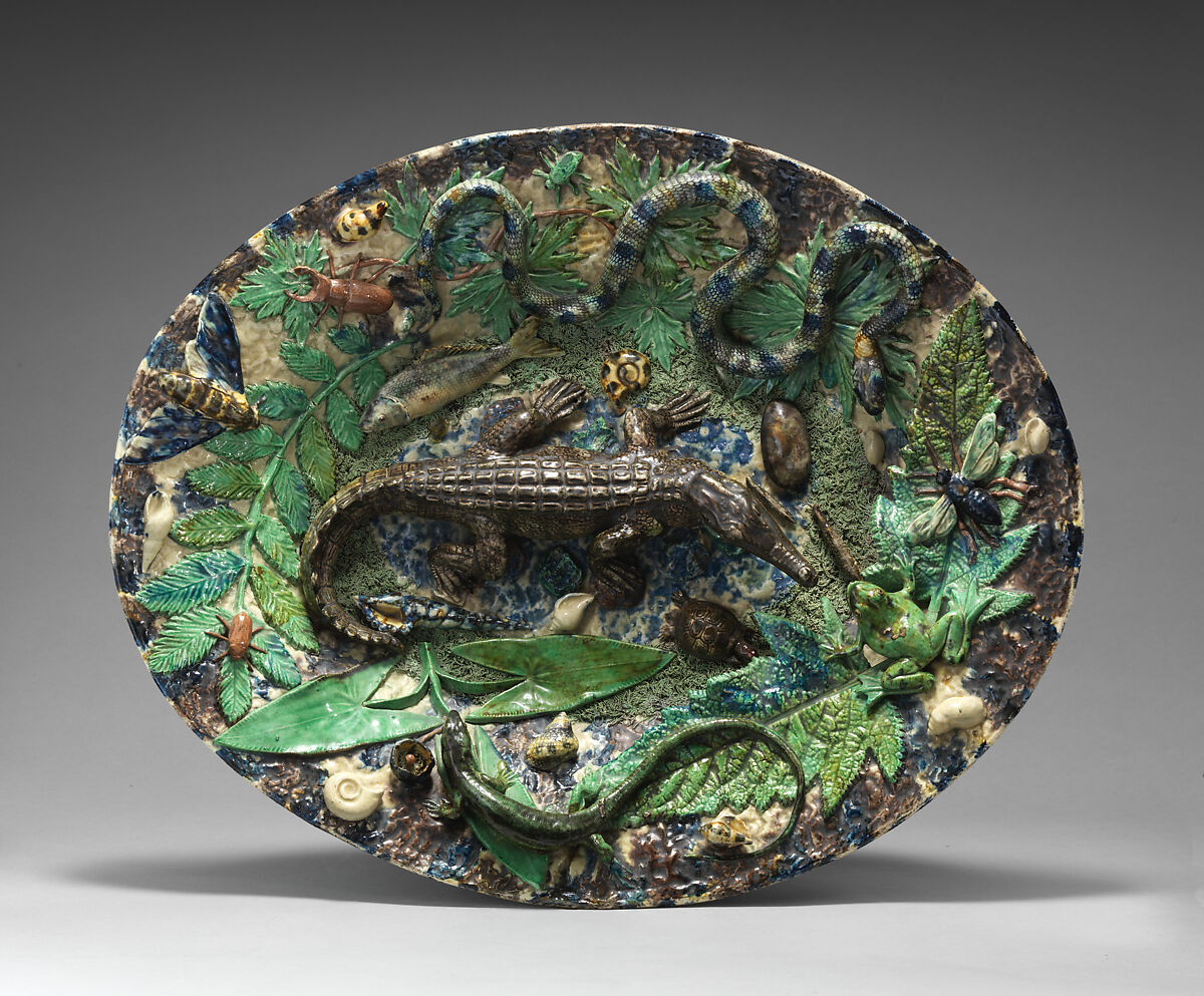 Inspired by the works made by the Renaissance ceramicist Bernard Palissy (1510-ca.1590), nineteenth-century producers of Palissy ware combined novel motifs with traditional techniques. A crocodile, which were not a typical feature of the sixteenth-century potter’s work, occupies the center of this platter teeming with life.