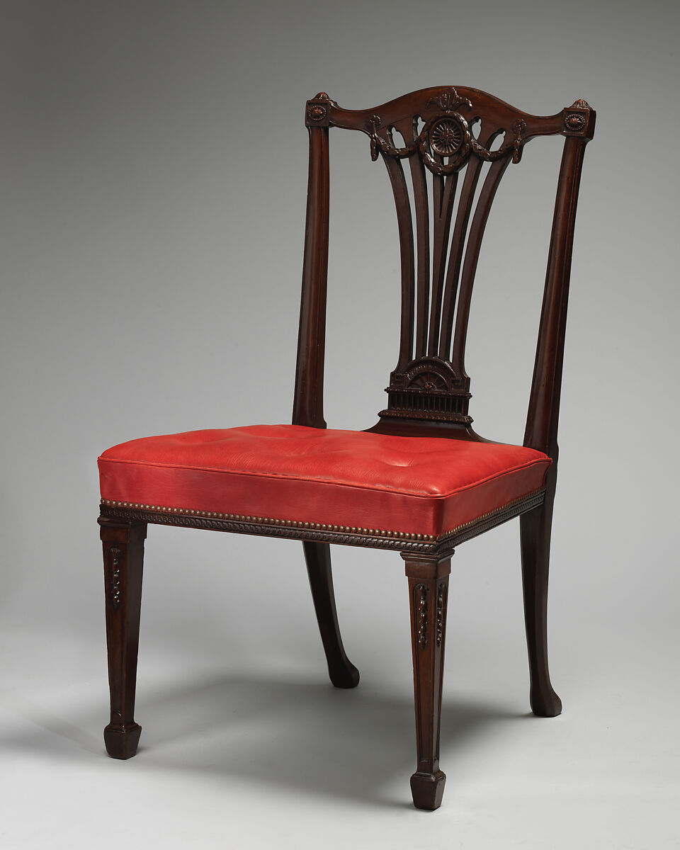 Thomas Chippendale executed this set of Neoclassical dining chairs for Goldsborough Hall in Yorkshire, which belonged to Daniel Lascelles, younger brother of Chippendale's longtime patron, Edwin Lascelles, 7th Baron Harewood, of nearby Harewood House. The chairs, originally a set of fifteen, represent one of Chippendale's most elegant designs: they have tapering backs with arched top rails, fan-shaped splats with a central patera encircled and flanked by pendent bellflower swags, and square, tapering legs decorated with pendent husks. He produced several sets of these chairs with minor variations, including one for Lansdowne House, London, from which the dining room is now preserved at The Met (32.12). The present set of mahogany chairs has been reupholstered, as it was originally, in red morocco leather.