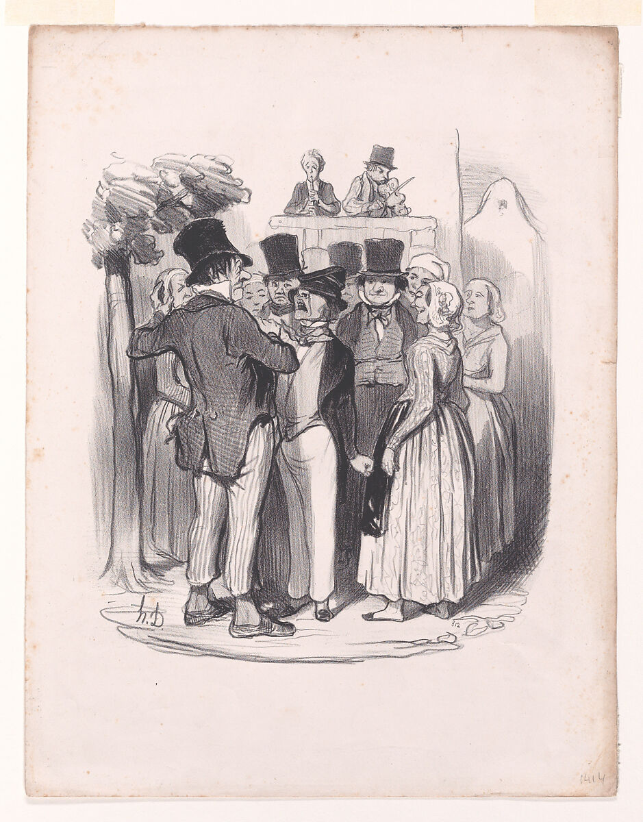 This print is part of a series in which Daumier satirized the romanticization of life in the country. Here, in the midst of an outdoor dance, a protective father at left confronts a Parisian interloper at center, pulling his hat down over his head to prevent the city-dweller from making eyes at his daughter.