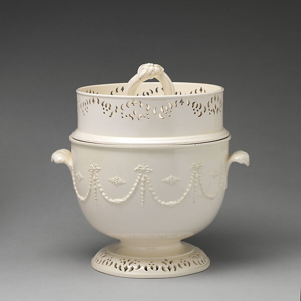 This pair of fruit coolers by Wedgwood combines a delicate, lace-like pattern of pierced decoration with festoons, a popular feature in the neoclassical architectural decorations of the second half of the eighteenth century in England.
