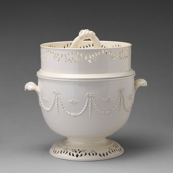 This pair of fruit coolers by Wedgwood combines a delicate, lace-like pattern of pierced decoration with festoons, a popular feature in the neoclassical architectural decorations of the second half of the eighteenth century in England.