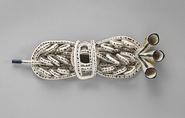 Pipe whimseys, also called puzzle pipes, were made by Staffordshire potters in the eighteenth and nineteenth centuries. They were said to have been made at the end of the day, with leftover pieces of clay. Though tobacco could be smoked from the pipes, they were primarily intended as decorative pieces of “whimsy,” objects made to stir the imagination and stimulate the mind. This is a rare and complex example with three pipe bowls.