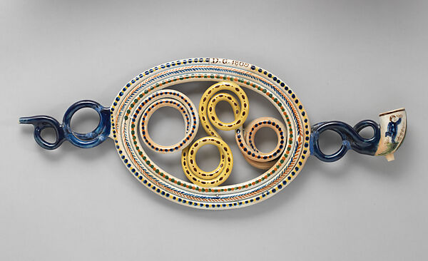 Pipe whimseys, also called puzzle pipes, were made by Staffordshire potters in the eighteenth and nineteenth centuries. They were said to have been made at the end of the day, with leftover pieces of clay. Though tobacco could be smoked from the pipes, they were primarily intended as decorative pieces of “whimsy,” objects made to stir the imagination and stimulate the mind. This example has an elegant series of figure eights set within tightly wound coils arranged in an oval form.