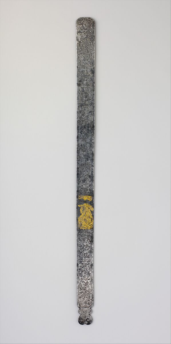 This busk was made for Anne-Marie-Louise d'Orléans (1627-93), Duchesse de Montpensier, daughter of Gaston d'Orléans. On the front, the arms of the Duchesse d'Orléans with fleur-de-lis and crown are accompanied by the text: "How I envy you the happiness that is yours, resting softly on her ivory white breast. Let us divide between us, if you please, this glory. You will be there the day and I shall be there the night." At the portrait head of a woman, the text reads, "Whether I live or die, I want my heart to be thine." On the back, the text accompanying clasped hands reads, "Faithfulness is above all." At the portrait of a man, the text reads, "My eyes to everyone; my heart to you."