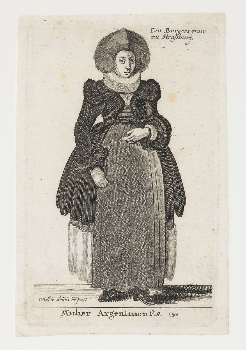 Wenceslaus Hollar was one of the most important printmakers of the seventeenth century. His technical virtuosity and his ability to render things, places, and people with astonishing detail and truthfulness has been highly regarded since his lifetime. Here, a woman from Strasbourg stands in profile wearing a dark fur hat with a pointed crown, and a ruff. Her white apron falls over a dark coat with fur collar, fur-trimmed dress, muff, and shoes decorated with ribbon rosettes.