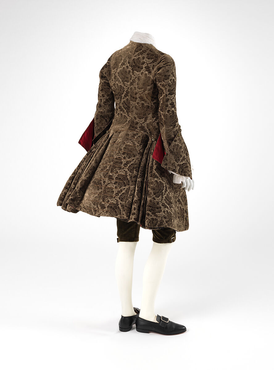 By the early eighteenth century, the skirts of men's formal coats became so generous that a woman observed in The Spectator, "The skirt of your fashionable coats forms as large a circumference as our petticoats." Drawings and paintings of the period reveal the feminine silhouette achieved by such full-skirted coats. The men's coats, which fall to the knees, almost conceal the breeches, a feature that serves to enhance their dresslike appearance.
