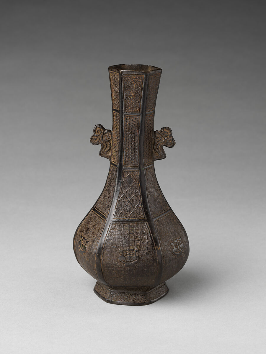 Hexagonal vases are among the most prevalent type of flower vases deriving from archaic vessels in the Yuan dynasty. Like other fourteenth-century bronze vases, this example displays multiple intricately cast panels of archaic and contemporary motifs, such as the modified animal masks, vegetal scrolls, and lozenge pattern. Its long, flaring neck and pear-shaped body are unmistakable features of thirteenth- to fourteenth-century ceramics. However, its hexagonal form, readily created in cast bronze, influenced contemporary ceramics.