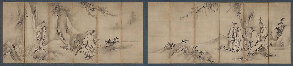 This pair of screens portrays well-known but seldom pictorialized stories. At right is Huang Chuping, a shepherd who gained the ability to transform stones into sheep. Flanked by his skeptical brother and a young attendant, Chuping fixes his gaze on a bright white rock in the bottom of the third panel, where a smudge of ink suggests an impending transformation. At left is a pair of recluses. Xu You, disquieted after declining an offer to take over the empire, rushes to wash his ears in a spring. Chaofu decides that the spring is now too polluted to water his bull.
