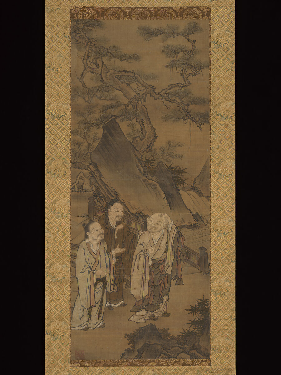 The legend of this encounter of three celebrated figures emerged during the Song Dynasty (960–1279) and advanced a syncretic view of China’s three main belief systems—Daoism, Buddhism, and Confucianism. It was introduced to Japan during the early Muromachi period (1392–1573), probably alongside Chinese paintings of the subject, and by the fifteenth century was a common pictorial subject associated with Japanese Zen Buddhism. During the sixteenth century, this and other Zen subjects were commonly depicted by professional painters, such as those of the Kano school. In the present example, painted late in the Muromachi period, the trio of figures standing before a bridge that spans a small creek occupies the lower half of the picture. The tonsured Huiyuan, at right, holds his hand to his head and gestures as if he’s just become aware of his transgression, while his companions laugh and point. Rocks and a wildly gnarled pine tree in the upper half of the picture hint at the landscape of the Lu Mountains.