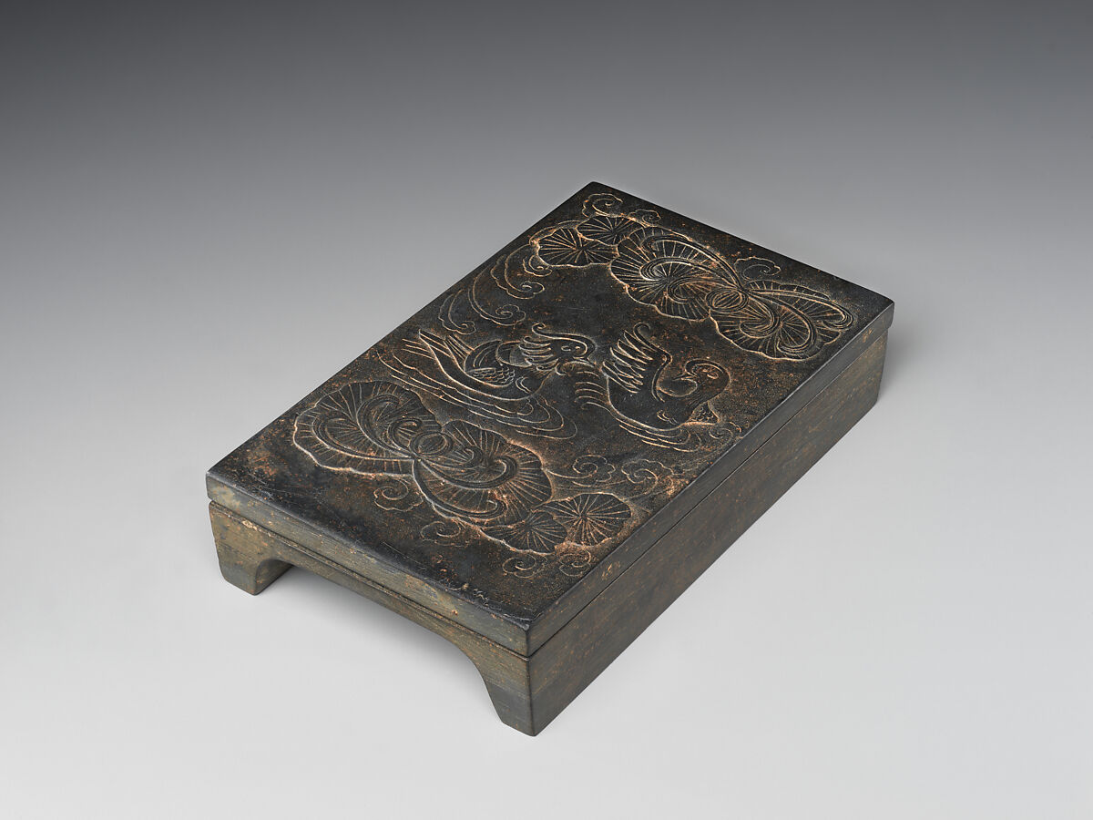 The simple, functional form of this work is typical of Song literati inkstones. Its cover is finely carved with a pair of mandarin ducks swimming in a lotus pond. The low-relief birds and lotus are further animated by lightly engraved ripples and windswept clouds. Similar patterns found on contemporary ceramics as well as on metalwork in gold or silver attest to the extensive exchange of motifs across different media at this time.