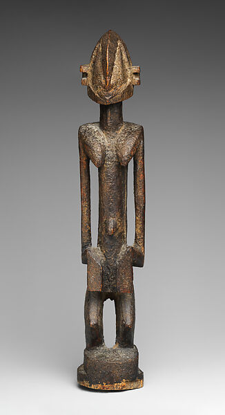 Refined, geometrically rendered figures known as dege dal nda served as focal points for prayer and remembrance among the Dogon. Such sculptures might be maintained on a binu (altar) within a family home, where they received offerings of grain and other libations, a treatment evident in this example’s uneven, pebbled surface. They could also be brought out from the home and displayed on rooftop terraces during the funeral rites of prominent male members of the community. This classic example depicts an elongated female figure with pronounced breasts and hands framing her lower abdomen. Those visual references underscore the interconnection of fertility and devotional practices directed to individuals who had transitioned from the living realm into that of the ancestors.