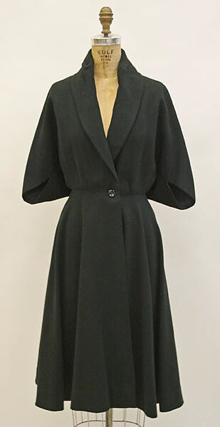 The bodice of the coat is formed by two pattern pieces, but unlike other designers who would conceive of a tailored garment as front and back, Gres thinks of the pattern piece as right side and left side, mirror images that are draped into form. Thus, there is no shoulder seam; it is as if Grès has shifted 90* from conventional tailoring, allowing the seam at center back, but none at the shoulder.