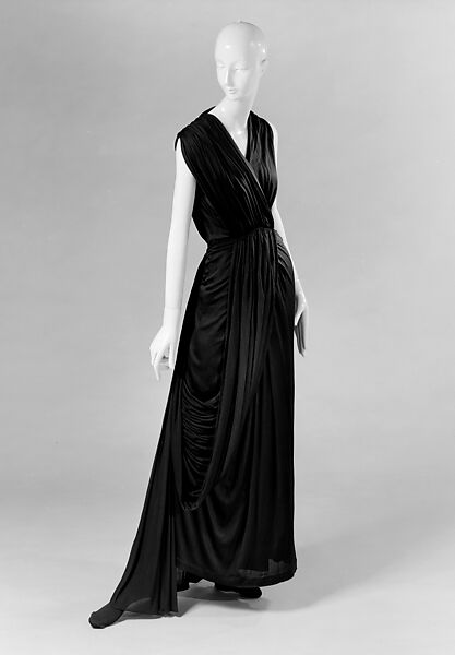In a variety of materials, Grès gathers fabric asymmetrically in a fluid animation. In this instance, cloth is gathered at the left shoulder and hip with the result of what Harper's Bazaar described of Grès gowns of the time "these graceful dinner dresses."
