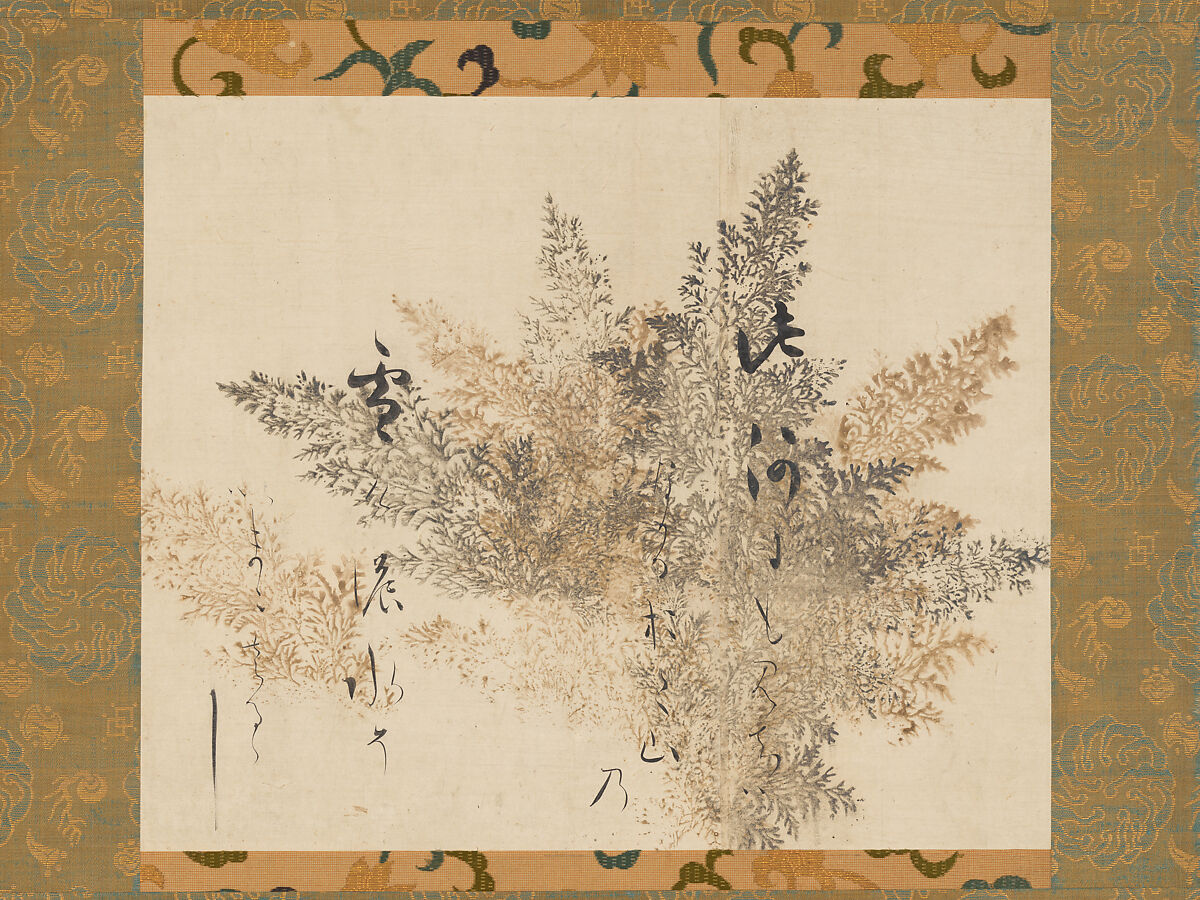 Overlapping fronds of moss ferns (shinobugusa) create a dramatic gold and silver background for a dynamically brushed waka in the distinctive style of Hon’ami Kōetsu, one of the most highly regarded and influential calligraphers of the early seventeenth century. The winter poem from the Collection of Poems Ancient and Modern (Kokin wakashū) is rendered in the scattered-writing (chirashi-gaki) mode, with staggered columns. It reads: