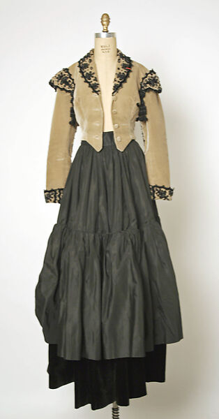 This evening ensemble consists of a waist-length jacket (a) and full, floor-length bell-shaped skirt (b). The jacket, modeled after a matador's costume, is made of putty-colored velveteen trimmed with appliqués of black velvet embroidered in jet beads and edged with black silk cord. The black taffeta skirt has a very deep flounce applied above the knee, extending to mid-calf and covering the upper edge of the deep velveteen border above the hemline.