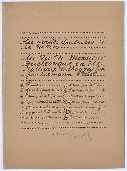 One of two series produced by Hermann-Paul under the ironic heading of "The Great Spectacles of Nature," the suite of ten prints follows the life cycle of the average bourgeois Frenchman in the last decade of the nineteenth century. Between birth and death, he falls in love twice; fulfills his patriotic and civic duties; is decorated and celebrated by his friends; enters public service to appear in official ceremonies; then falls ill. With this portfolio, Hermann-Paul established his reputation as a talented lithographer and biting satirist. Borrowing the language of the natural scientist, he mocks the customs and morals of his contemporaries with his caricatural style.