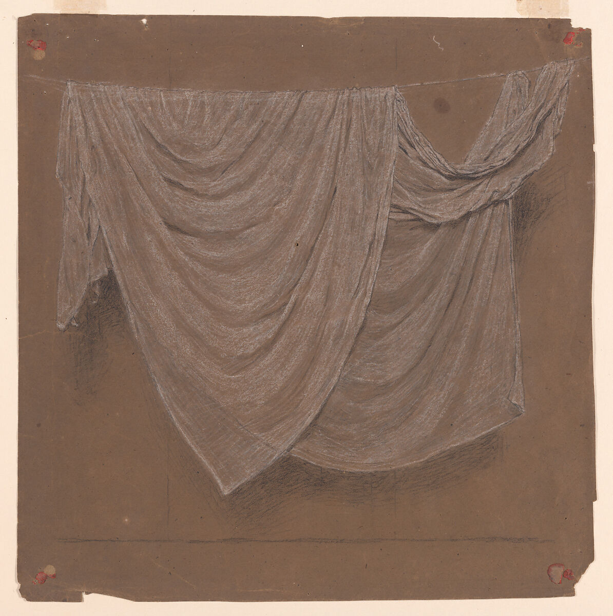 This sensitive study of artfully arranged semi-translucent drapery hanging over a line relates to Moore's painting "Battledore" (1868–70; Minneapolis Institute of Art). In the latter, a similar cloth forms a backdrop for a young woman dressed in classical robes as she holds a racket ahd shuttlecock (battledore is an old name for badminton). The artist was a leader of the Aesthetic Movement whose proponents believed subject matter to be less important than beautifully arranged forms and harmonious colors. When preparing a composition, Moore made studies of figures, draperies and details which reveal how his ideas developed. His choice of rough brown paper to serve a support for studies was taken up by James McNeill Whistler who used it for pastel drawings.