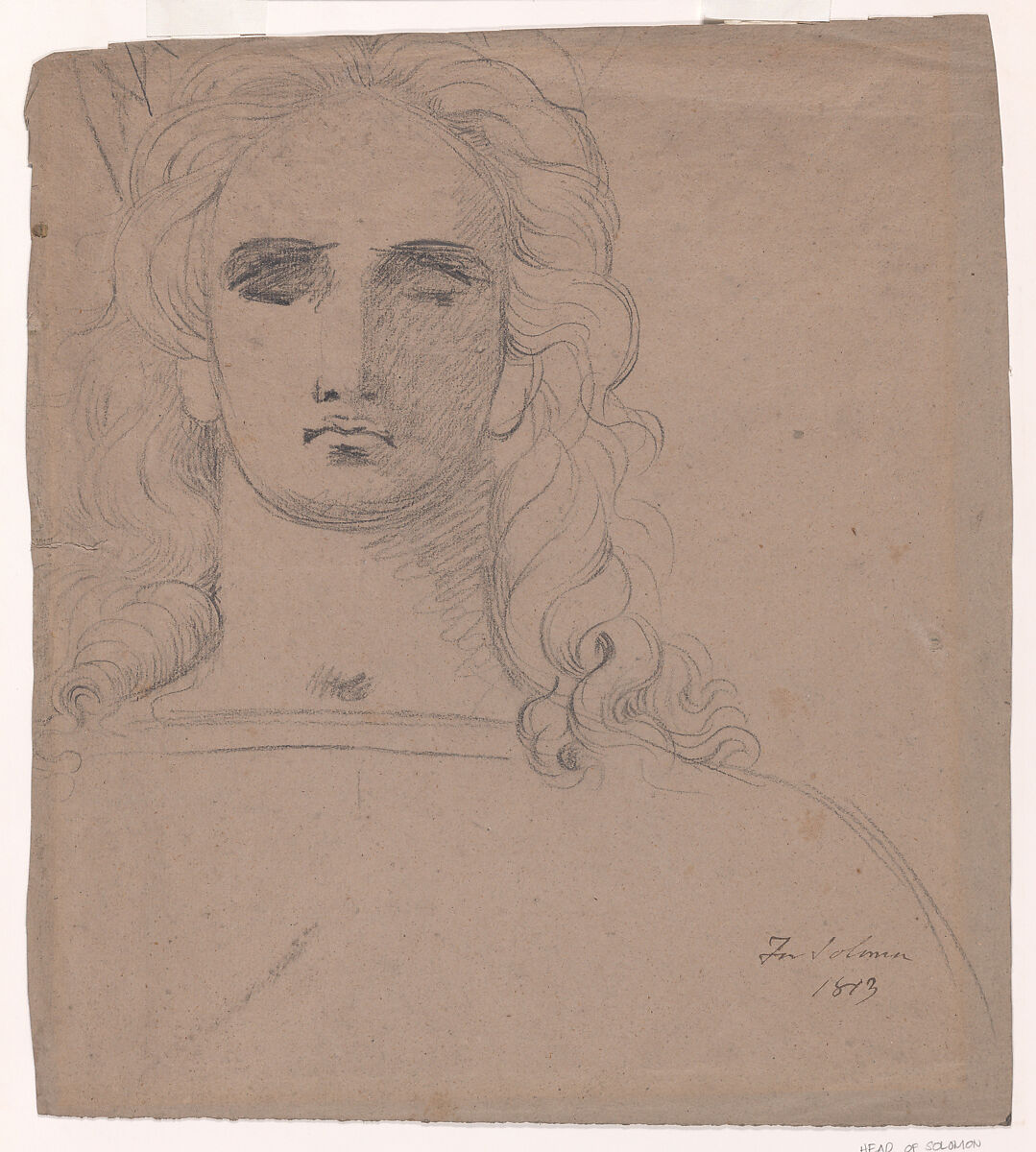 Ambitious to prove himself as a history painter, Haydon painted a large "Judgment of Solomon" between 1812-14. This is one of a pair of drawings where he developed the key figure of the king, a subject he discussed in his journal on April 8, 1812: "I wish to express Solomon a fine youthful king of Israel...cllothed in gold, with a sceptre and a crimson robe, his face youthful--dignity commingled with wisdom." This image of a youthful, long-haired figure with a classical face and looking down is close to the figure in the painting (an earlier drawing presents a more mature man with dark hair). Haydon worked from models and studied Raphael's Cartoons to establish the composition that he exhibited at the Oil and Water Colour Society, Spring Gardens in 1814 (now Plymouth Museum and Art Gallery, UK).