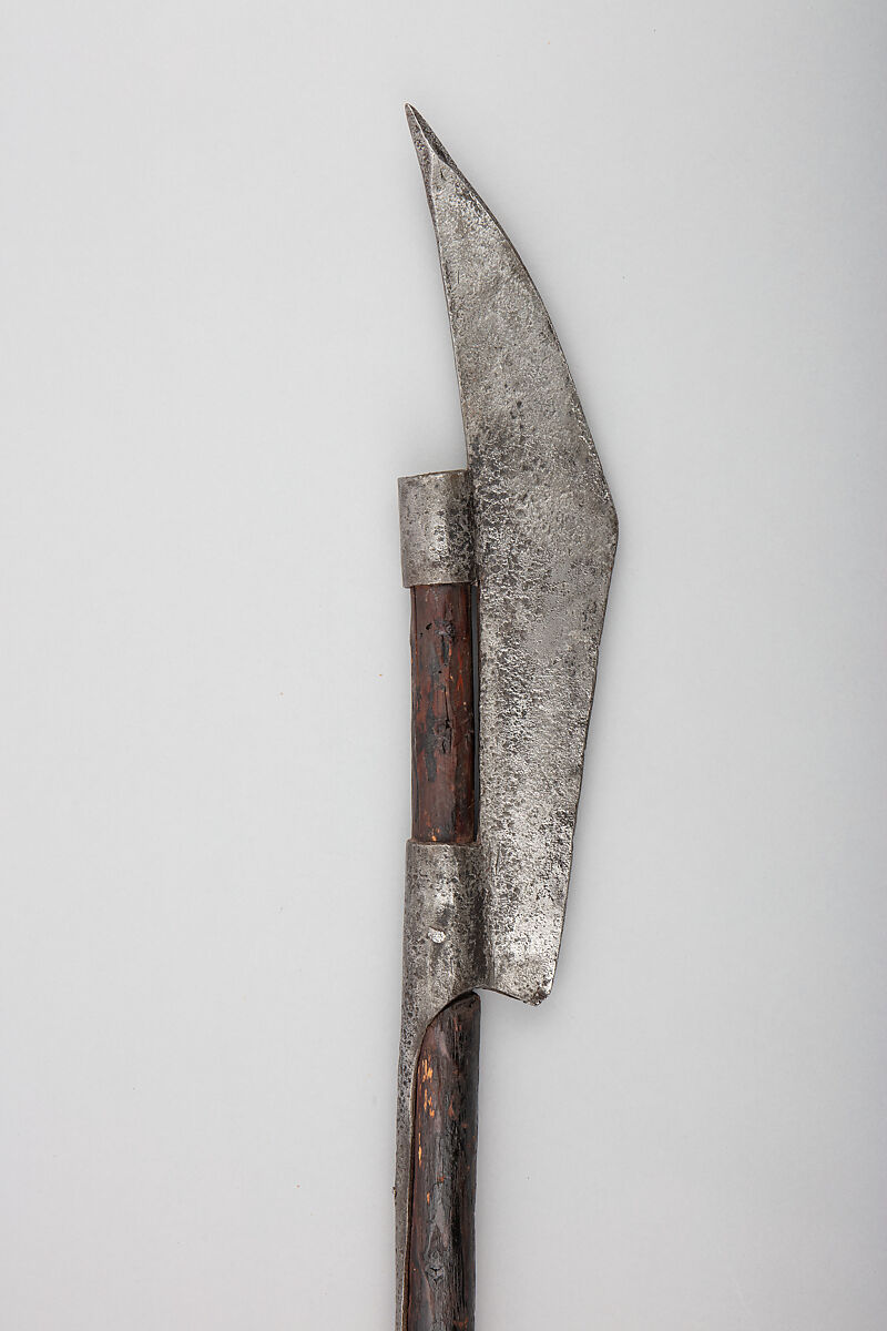 The halberd is the signature weapon of Switzerland, a real and symbolic manifestation of Swiss independence, which was safeguarded in the late medieval and early Renaissance periods by the ability of non-noble infantry armed with such weapons to successfully confront outside armies that relied on traditional heavy cavalry comprised mostly of noblemen. This halberd is rare and important for its early date, indicated by its form and construction; for retaining its original shaft, possibly the earliest original shaft to survive and a feature that is seldom found intact and unaltered on staff weapons predating the sixteenth century; and for the fact that the shaft is round in cross section, another early feature that was superseded in the fifteenth century by the much more typical quadrangular section one sees on the hafts of most staff weapons. Also an early feature is the presence of two “eyes,” through which the top of the shaft is inserted. This form of construction was superseded by a stronger, centrally placed socket in the early fifteenth century. In essence, the head of this halberd represents an important early transitional stage in the development of halberds from long curved knives on poles into their canonical form comprising an axe blade combined with a spear point above and a spike behind. It presents a key step in the creation of what became a widely used tool in the democratization of warfare, with a long afterlife as a highly decorated ceremonial arm that was carried as a sign of rank, remaining in use in Europe and America well into the eighteenth century.