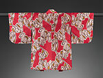 This abstract, stylized pattern was created by using four stencils to dye the wefts before weaving, a type of all-weft ikat technique. The ground color, a dark strawberry red, was achieved by crossing plum-red wefts (transverse yarns) with dark red warps (longitudinal yarns). This vivid lined jacket was made in Isesaki, in Gunma prefecture, north of Tokyo, during the brief revival of meisen production following the Second World War.