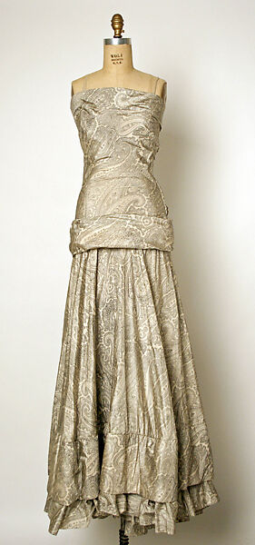 This evening dress of white taffeta has an allover chine pattern in a paisley motif in black. The bias-cut torso folds over to form a cuff across the neckline. There are narrow chiffon shoulder straps. A padded band of self-fabric accentuates the dropped waistline. The floor-length evening dress has a full outer skirt with two layers of large ruffle at the hem, which is supported by an underskirt of two taffeta flounces and horsehair.