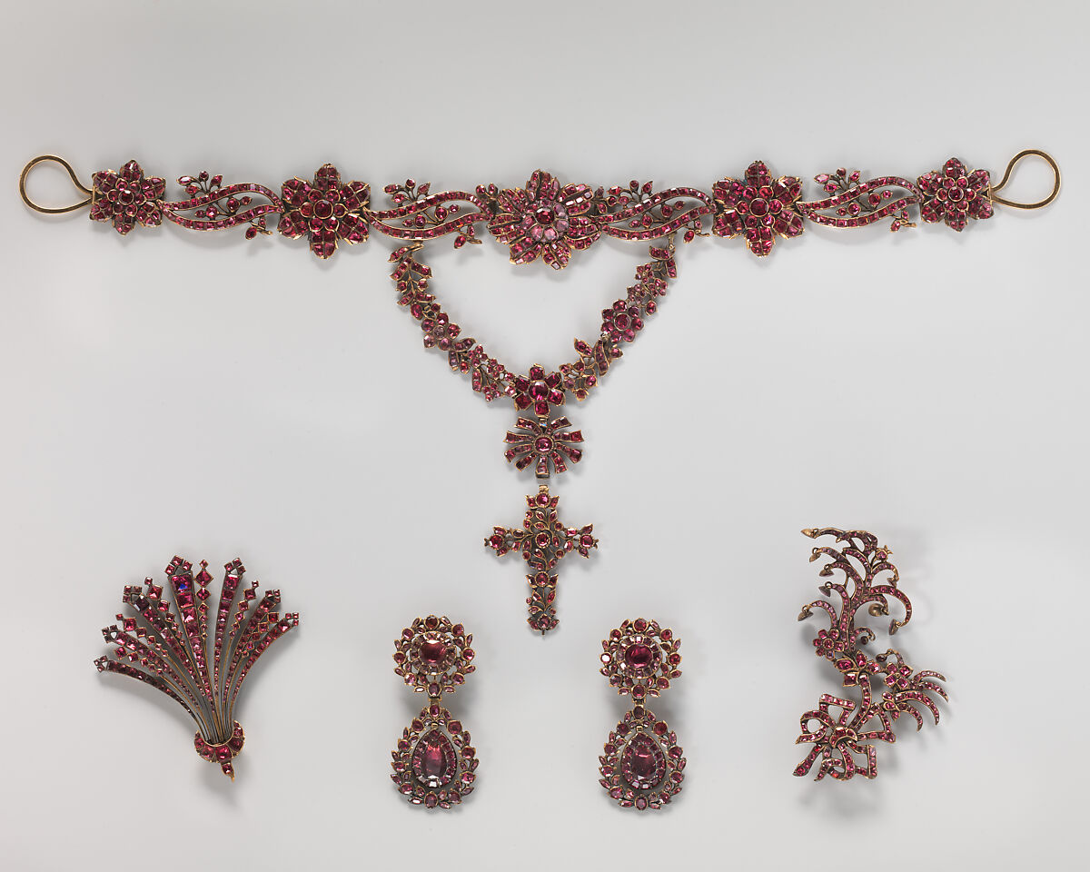This matching set of jewelry, or parure, consists of different elements and includes a necklace, a pair of earrings, and two hair ornaments kept in their original case. Set in gold, the pieces are mounted with faceted garnets that have been backed by pink metal foil to enhance their color. Garnets were very fashionable in the eighteenth century and were used to create attractive and affordable jewelry especially for young women. The various detachable parts, such as the festoon and cross-shaped pendant of the necklace, and the lower pendants of the earrings, made the jewelry versatile and suitable to be worn by day or at night. Since the jewelry is not signed, it is not known who made this particular parure. Similarities to designs by Jean Baptiste Piauger published in his Traité des Pierres Précieuses et de la maniere de les employer en Parure of 1762, however, suggest a French origin.