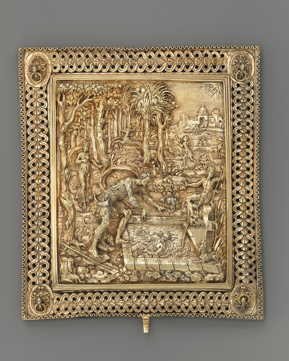 Visually rich, narratively dense, and rendered with exquisite craftsmanship, this gilded silver plaque was likely meant to adorn a box or cabinet. Precious metal plaques of this kind were a specialty of the Jamnitzer family. Four consecutive generations of these Nuremburg goldsmiths reached the apex of their skill in Christoph Jamnitzer (1563–1618), grandson of famed sixteenth-century master Wenzel Jamnitzer (1507/8–1585). This relief combines several episodes from Ovid’s story of Narcissus from his famous text published in 8 A.D., the Metamorphoses, depicted as a continuous narrative within a unified pictorial space. In the background is Narcissus, as he is first described by Ovid seen through the eyes of his admirer, the nymph Echo, who sees him hunting deer in the forest with horn raised and hounds in pursuit. Echo, who follows Narcissus unnoticed, is in the midground. In the foreground, the beautiful youth approaches his fateful pool. Gazing down, he becomes infatuated with his own reflection and cannot leave the water’s side, doomed to die of unrequited love as punishment for not having reciprocated the love of others.