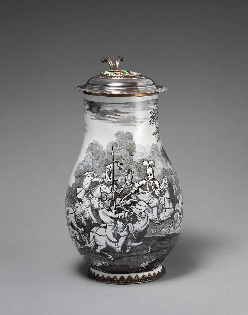 Wolgang Rössler is recognized as the most important independent decorator of German faience active in Nuremberg. He specialized in schwarzlot, a black and white decoration technique that drew upon Rössler’s parallel work as a copper engraver. His talents are evident in the complexity of the battle scene, with plumes of smoke created by the warring figures on horseback.