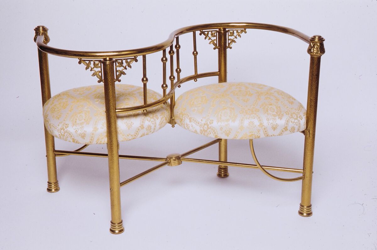 Although brass beds from the late nineteenth century are common, other types of American furniture constructed of that metal are quite rare, especially in such an unusual form as this tête-à-tête. It was given to Thomas Stonewall Kyle (1865–1940) and Sudie Wainwright Murphy (1867–1946) as a wedding gift in 1887.