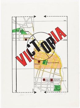 Victoria siempre (Victory Forever) belongs to Margarita Paksa’s series of works on paper based on cartographies, titled Diagramas de batallas (Battle Diagrams). Made between 1970–76, they consist of enlarged words in Spanish such as Victoria, La comida, Libertad, Violencia…overlapping fragments of local maps. The words make reference to the exceptionality of the historical moment of dictatorship in Argentina in the early 1970s, while the maps signal key locations in Buenos Aires and Rosario where popular reactions against the repressive forces of the government were more active and intense. Here Paksa uses the spherical mark of the objective lens of a riflescope to amplify and distort the word Victoria (Victory). This typographic device is reminiscent of agitprop, contextualizing the urgency of her work within the sociopolitical situation in Argentina.