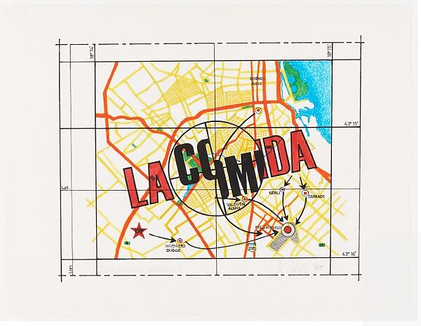 La comida (The Food) belongs to Margarita Paksa’s series of works on paper based on cartographies, titled Diagramas de batallas (Battle Diagrams). Made between 1970–76, they consist of enlarged words in Spanish such as Victoria, La comida, Libertad, Violencia…overlapping fragments of local maps. The words refer to the exceptionality of the historical moment of dictatorship in Argentina in the early 1970s, while the maps signal key locations in Buenos Aires and Rosario where popular reactions against the repressive forces of the government were more active and intense. Here Paksa uses the spherical mark of the objective lens of a riflescope to amplify and distort the word Comida (Food). This typographic device is reminiscent of agitprop, contextualizing the urgency of her work within the sociopolitical situation in Argentina.