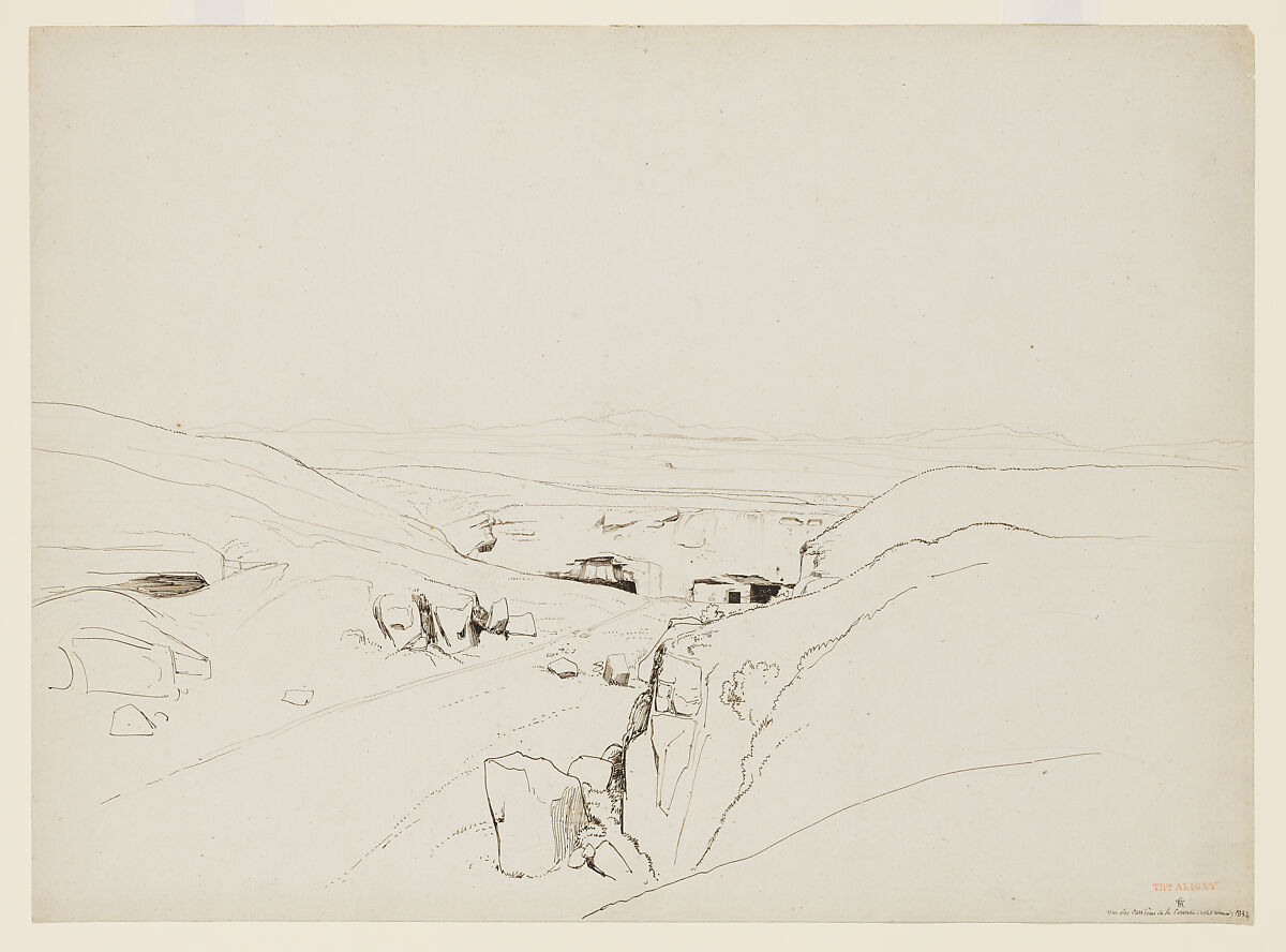 Aligny made this strikingly spare drawing in 1834, during his second visit to Italy. It presents an expansive view over the quarries at Cervara in the countryside east of Rome. A decade later, back in Paris, he revisited the subject in the painting he submitted to the Salon of 1844 (now lost).