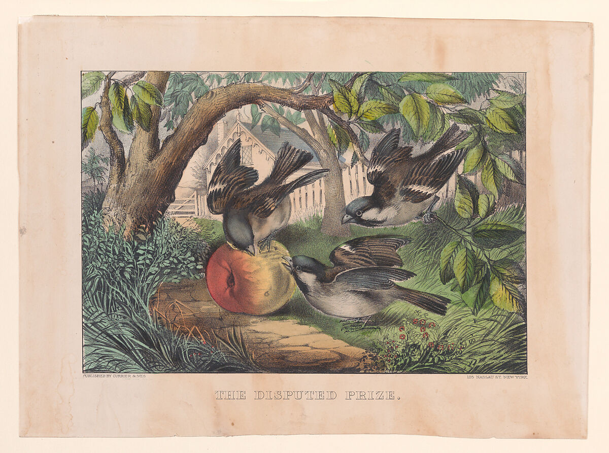 Three finches (with striped wings and short beaks) fight over a fallen peach on a garden path. Leafy boughs grow overhead and a Gothic Revival cottage with drip moldings adorning its roof is seen in the distance.
