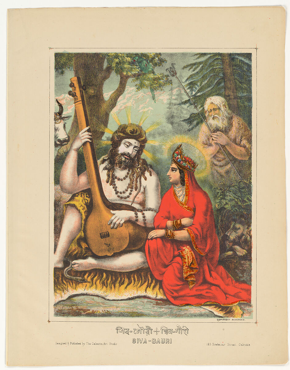 Depictions of Shiva and Parvati-Gauri in their Himalayan abode on Mt. Kailash has been a favorite subject since the early medieval period, as relief sculptures from Kashmir and Nepal attest. Here the artists of the Calcutta Art Studio have re-envisaged this traditional subject, creating a hybrid interpretation that owes as much to late Victorian imagery as it does to Indian conventions. The incident depicted is elaborated in the note sheet that accompanied this print: Gauri asked Shiva to explain the secret of the Yoga-shastra to her, but as this is not intended for human ears, they found an isolated spot and placed Nandin to stand guard. Eventually Gauri fell asleep while Shiva went on talking, but Shiva was so absorbed in his exposition that he continued without noticing. When Gauri woke up she asked what she had missed. Shiva was surprised. Someone has been saying “Ay” to him at the end of every point. Looking about they discovered a bird hidden in a nearby tree. Wishing to preserve the secret knowledge of yoga, Shiva aimed his trident at the bird. The bird hastily escaped, with the trident hot in pursuit. After flying all over the world, the bird finally took refuge in a woman’s womb, certain that Shiva would not kill a female. The woman became wife of Vyasa, and their child later revealed the secret Shastra of yoga that it had overheard Shiva telling Parvati.