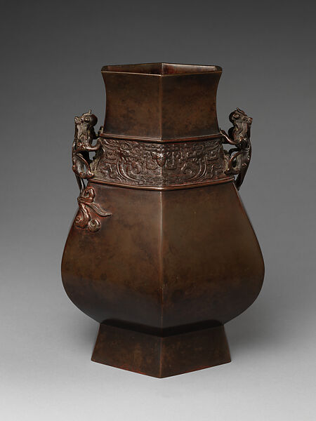 This work of art is currently on loan to the museum.This magnificent vase exhibits the fascination with archaistic designs prevalent during the Qing dynasty. Its form follows that of an ancient square wine container (fanghu) but is transformed into an unusual six-sided shape. The only décor on the otherwise unadorned surface encircles the vessel’s neck. The four broad facets of the vessel feature a band of intertwined mythical creatures in low relief covered with dense spirals reminiscent of archaic designs. Each of the narrow facets features a sinuous creature in high relief that together serve as handles. The vessel base bears a spurious mark “Made in the Xuande period of the Great Ming.” Judging from its form, ornament, and the writing style of the mark, this piece was not made during the Xuande period (1426–35); rather, it is a work of the eighteenth century that reflects the fascination with archaistic designs prevalent at that time.