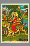 Ambika is a form of the Hindu goddess Parvati. She is represented with eight arms holding multiple weapons, including a sword, trident and discus. She is seated on her vehicle, the tiger. Depicted here also are several images of her being worshiped by devotees.