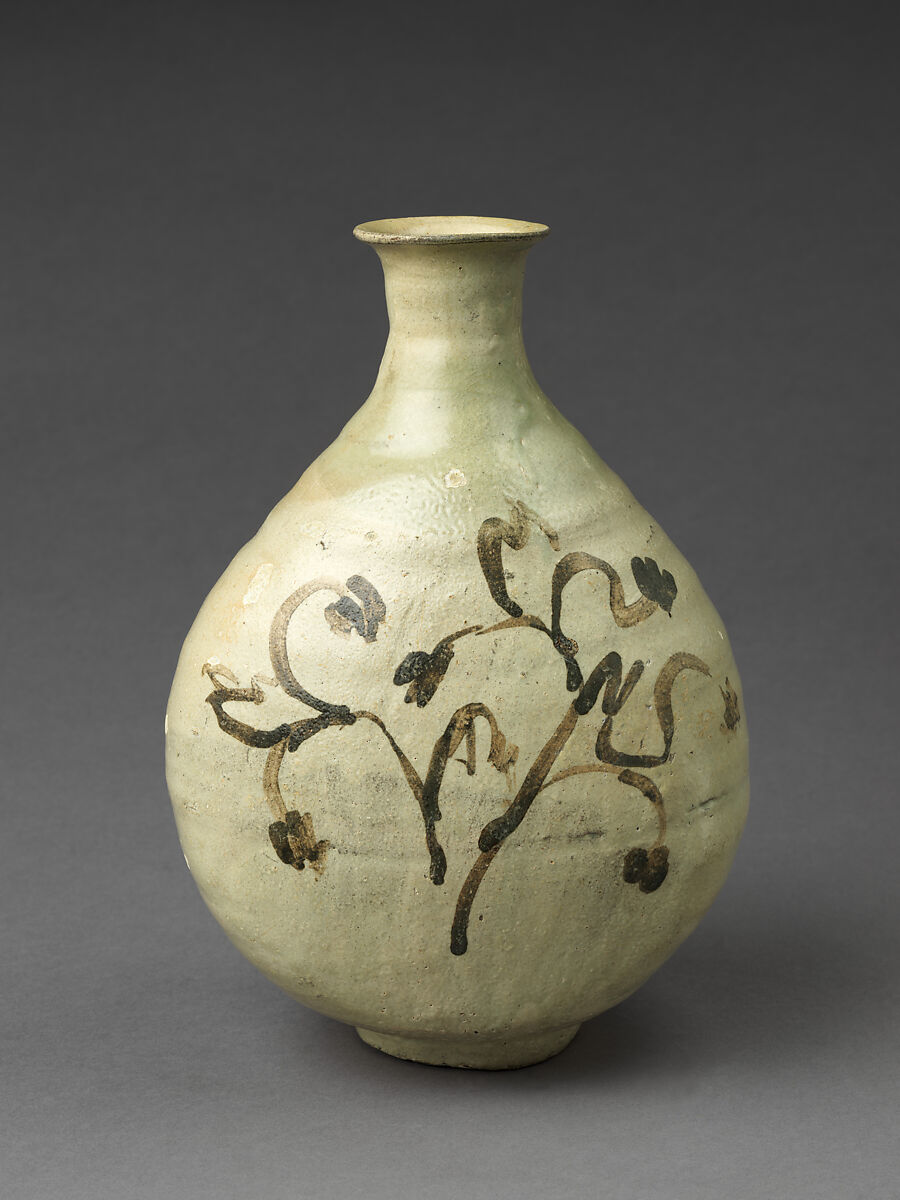 This flask-shaped bottle decorated with iron-brown flowering plant is an excellent and rare example of buncheong ware. Iron-brown ornamentation was primarily implemented in the Gongju Hakbong-ri kilns in South Chungcheong Province, of which the Met’s jar with floral scroll (2006.241) is a good example. Differing from that jar with the partially covered slip on a dark clay body, this bottle has a finer, white clay body that is almost entirely covered in slip. The flowering plant is represented in a whimsical manner with confident brushwork. These qualities indicate that this bottle was produced at the Goheung Undae-ri kilns in South Jeolla Province, a region that predominately produced incised and sgraffito buncheong wares (1986.305 and 16.122.1). There are only two other known examples of intact bottles with this design and they are in Japanese and Korean museum collections.