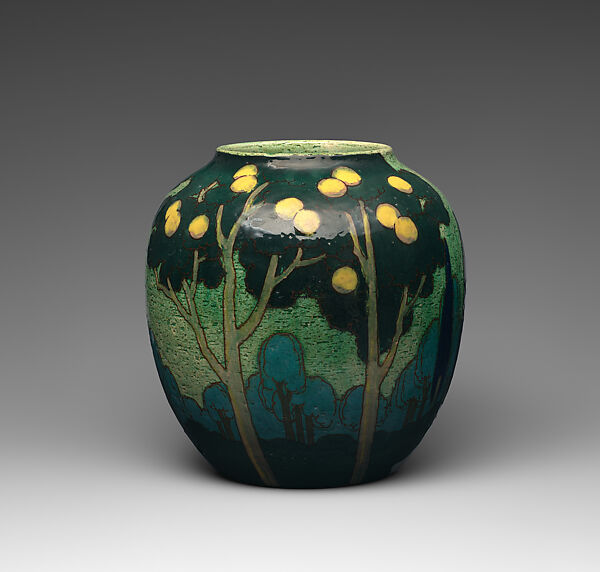 Royal Doulton rose to prominence in the second half of the nineteenth century as an industrial ceramics firm that produced a range of wares for the middle class market in Victorian England. This example demonstrates the firm’s shift to art pottery. Barbotine, or colored-slip painting has been used to depict a fantasy landscape in the evening that evokes the techniques of the Nabis, who explored the use of bright colors and flat patterns in their moody paintings at the turn of the twentieth century.