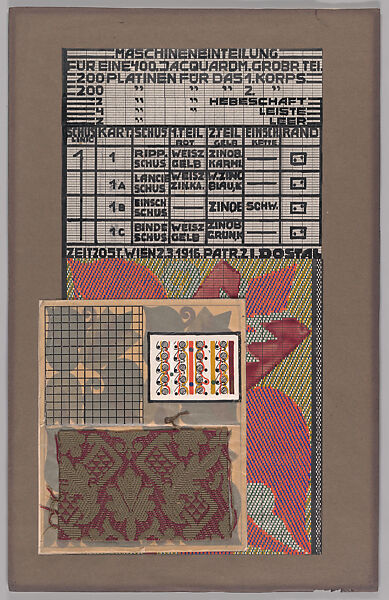 This is one of a group of seven textile designs by the Wiener Werkstätte. Three sheets contain one design each and are overall patterns made up out of semi-abstract naturalistic motifs. Four additional sheets are specifically related to woven textiles, and contain information and schematic overviews on how the fabric was to be woven. In some cases, fabric swatches have been pasted onto the sheets as well. They supply important information on how these textiles were designed and created. For instance, several of the weaving charts contain information on how many hours the production of the textile would take. The charts also carry dates, predominantly in the year 1914, which was the year in which the Werkstätte built a new factory for fashion and textile and greatly expanded their productivity in this area.