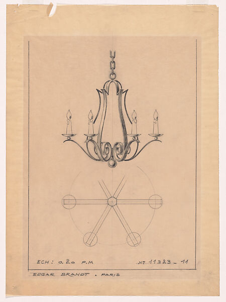 Elevation and partial plan of a chandelier, made by the Parisian firm of Edgar Brandt. The design is part of a group of fourteen drawings on transfer paper containing presentation drawings and specification drawings for a range of different types of furniture, but predominantly focused on tables and lighting fixtures. Among the tables there are designs for freestanding tables, console tables, and rolling bar carts. The lighting fixtures can be divided in chandeliers and wall sconces, some meant for candles, others for electrical light. Many of the drawings have inscriptions detailing measurements and/or scale, and for the majority a serial number is provided as well, which allows for the identification of surviving pieces of furniture.