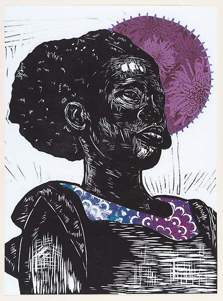 Martin layers colors, patterns, symbols, and techniques to create art that fuses, what she terms, "the real and the fantastic." Here, Martin pays homage to Elizabeth Catlett, an artist and printmaker known for her championing of social justice and positive representations of Black women. Martin combines linocut, a relief print method frequently used by Catlett, with hand stitching and decorative patterns. According to Martin, her subject represents the quiet strength and "natural beauty, cultural identity, and the complexity of the African American Woman." Behind the figure, a large circular form rendered in a purple floral pattern evokes the moon and its association with women and their spiritual life.