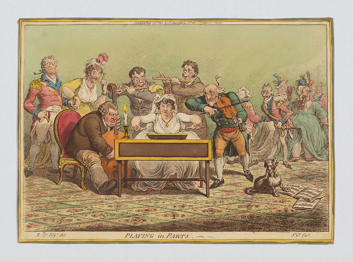Gillray makes fun here of a concert performed by amateur, centering his image on a young woman who energetically thumps a keyboard, accompanied by four men–a gouty cellist, a sawing violinist and two flutists. Attendees pay little attention to the music, since a young girl takes the opportunity to flirt with an officer at left and more military men at right shake hands, one bowing so low that his sword lifts the shirts a large lady behind him. Trenchant commentary is offered by a small dog that places a paw on a music book and howls.