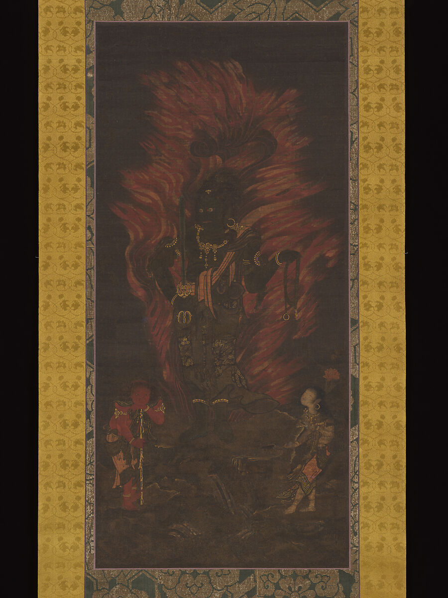 Fudō Myōō (Sanskrit: Acala Vidyaraja), The Immovable Wisdom King, surrounded by flames, stands on a rock and holds a sword and lasso. A wrathful avatar of Dainichi (Sanskrit: Vairocana), the Buddha of the Cosmos, Fudō vanquishes any evil that threatens to impede the Buddhist teachings. The anonymous artist illustrates the deity’s ferocity with wide and wild eyes, erect standing posture and towering size, and his flaming mandorla. He is flanked by his two attendants Seitaka and Kongara (Sanskrit: Cetaka and Kimkara), whose smaller size indicates their subsidiary role. The pale Seitaka gazes up at Fudō while the red skinned Kongara leans on a golden staff with his eyes cast down and a deep frown on his face. They wear matching attire of a reddish orange skirt with a green border and matching sash, all detailed in gold.
