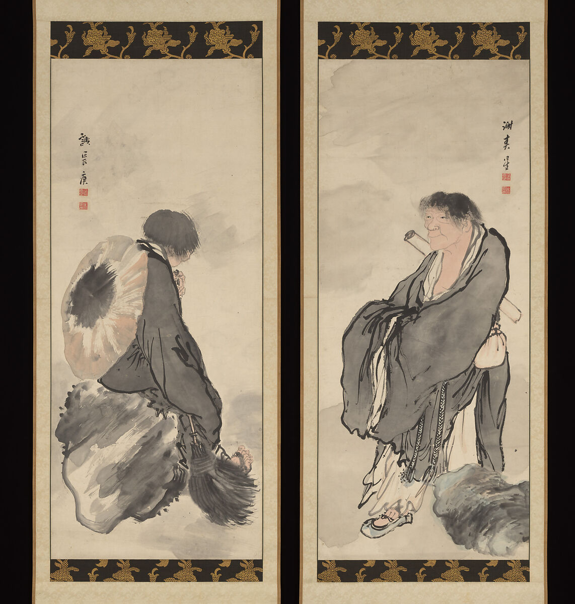This diptych by the poet-painter Yosa Buson portrays a pair of quasi-historical Chan eccentrics of the eighth century. On the right, the carefree Hanshan (Japanese: Kanzan) carries a scroll for writing poetry. Shide (Japanese: Jittoku), seen from behind, is partly obscured by a large bamboo hat; the broom he holds recalls his role as a temple janitor. Hanshan and Shide represent the iconoclastic quest of Zen Buddhism and were a popular theme in painting and poetry.